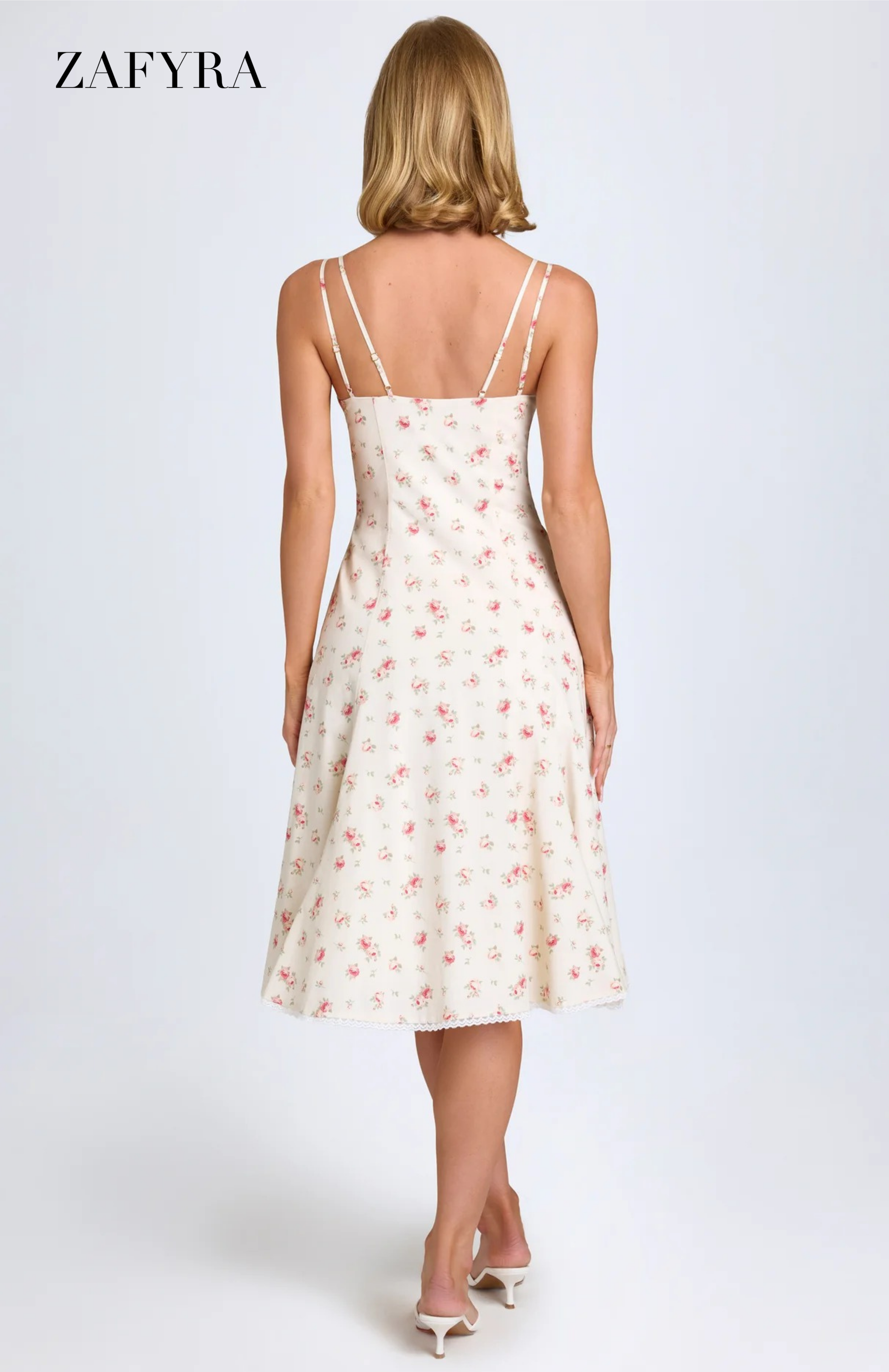 Vestido design italiano com detalhe de laço e acabamento em renda, estampa de rosas pequenas